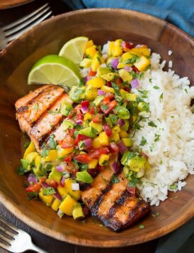 Grilled Lime Salmon with Avocado-Mango Salsa and Coconut Rice
