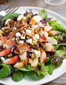 Apple Salad – made with an abundance of crisp sweet apples, fresh spring lettuce greens or spinach, crunchy toasted pecans, tangy feta, flavorful salty bacon and it’s finished with a vibrant maple cider vinaigrette dressing. It’s the perfect autumn salad!