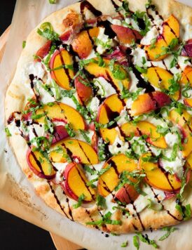 Three Cheese Peach and Prosciutto Pizza with Basil and Honey Balsamic Reduction